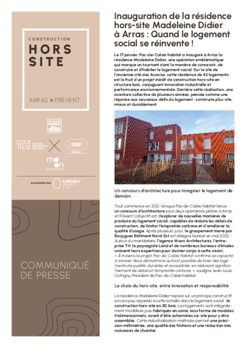 Le 17 janvier, Pas-de-Calais habitat a inauguré à Arras la résidence Madeleine Didier, une opération emblématique qui marque un tournant dans la manière de concevoir, de construire et d’habiter le logement social. Sur le site de l’ancienne cité des Acacias, cette résidence de 42 logements est le fruit d’un projet inédit de construction hors-site en structure bois, conjuguant innovation industrielle et performance environnementale. Derrière cette réalisation, une aventure collective de plusieurs années, pensée comme une réponse aux nouveaux défis du logement : construire plus vite, mieux et durablement.