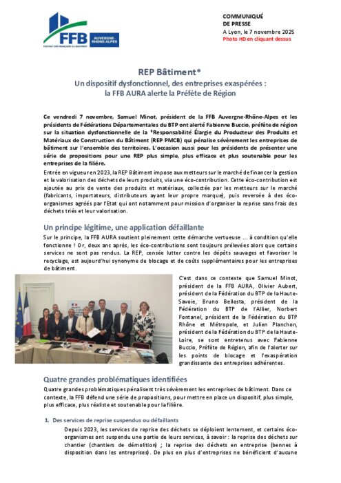 Ce vendredi 7 novembre, Samuel Minot, président de la FFB Auvergne-Rhône-Alpes et les présidents de Fédérations Départementales du BTP ont alerté Fabienne Buccio, préfète de région sur la situation dysfonctionnelle de la *Responsabilité Élargie du Producteur des Produits et Matériaux de Construction du Bâtiment (REP PMCB) qui pénalise sévèrement les entreprises de bâtiment sur l’ensemble des territoires. L’occasion aussi pour les présidents de présenter une série de propositions pour une REP plus simple, plus efficace et plus soutenable pour les entreprises de la filière.