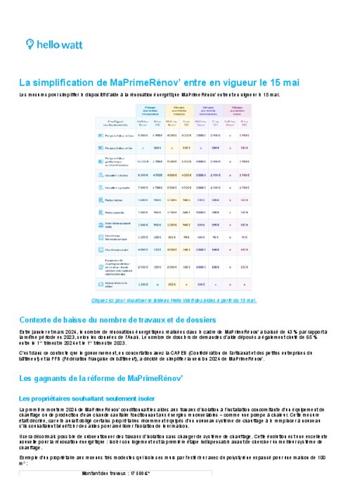 Industriels 07 mai 2024 - 11:16 Les mesures pour simplifier le dispositif d’aide à la rénovation énergétique MaPrimeRénov’ entrent en vigueur le 15 mai. Hello Watt revient sur cette évolution. PDF (175 Ko) Télécharger Crédits : Rene Asmussen (image d'illustration)