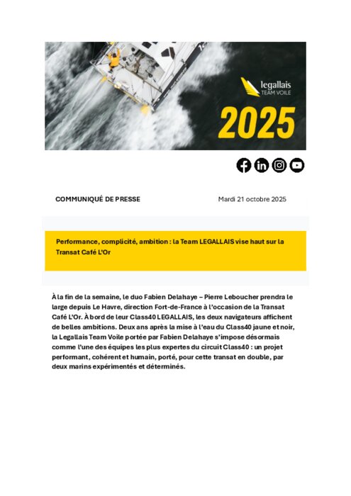 À la fin de la semaine, le duo Fabien Delahaye-Pierre Leboucher prendra le large depuis Le Havre, direction Fort-de-France à l’occasion de la Transat Café L’Or. À bord de leur Class40 Legallais, les deux navigateurs affichent de belles ambitions. Deux ans après la mise à l’eau du Class40 jaune et noir, la Legallais Team Voile portée par Fabien Delahaye s’impose désormais comme l’une des équipes les plus expertes du circuit Class40 : un projet performant, cohérent et humain, porté, pour cette transat en double, par deux marins expérimentés et déterminés.