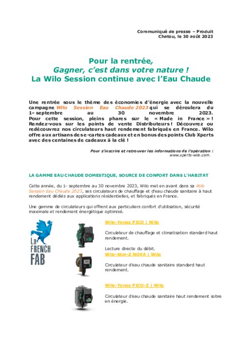 Industriels 30 août 2023 - 16:57 Une rentrée sous le thème des économies d’énergie avec la nouvelle campagne Wilo Session Eau Chaude 2023 qui se déroulera du 1er septembre au 30 novembre 2023. Pour cette session, pleins phares sur le « Made in France ». PDF (259 Ko) Télécharger