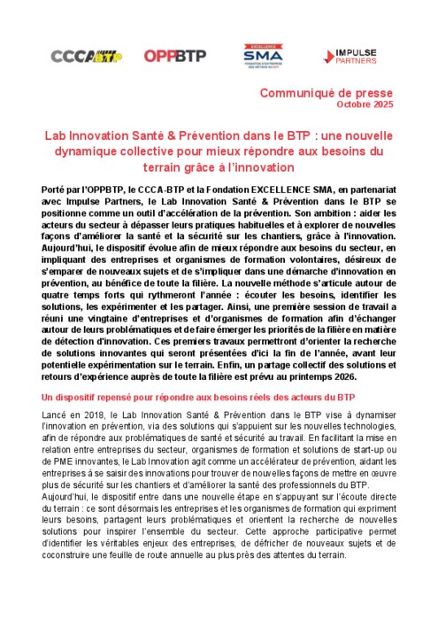 Porté par l’OPPBTP, le CCCA-BTP et la Fondation EXCELLENCE SMA, en partenariat avec Impulse Partners, le Lab Innovation Santé et Prévention dans le BTP se positionne comme un outil d’accélération de la prévention. Son ambition : aider les acteurs du secteur à dépasser leurs pratiques habituelles et à explorer de nouvelles façons d’améliorer la santé et la sécurité sur les chantiers, grâce à l’innovation. Aujourd’hui, le dispositif évolue afin de mieux répondre aux besoins du secteur, en impliquant des entreprises et organismes de formation volontaires, désireux de s’emparer de nouveaux sujets et de s’impliquer dans une démarche d’innovation en prévention, au bénéfice de toute la filière.