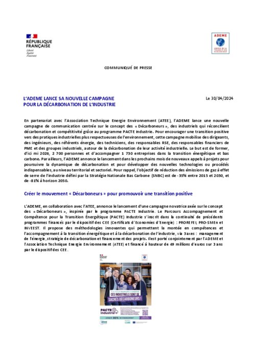 En partenariat avec l’Association Technique Energie Environnement (ATEE), l’ADEME lance une nouvelle campagne de communication centrée sur le concept des « Décarboneurs », des industriels qui réconcilient décarbonation et compétitivité grâce au programme PACTE Industrie.