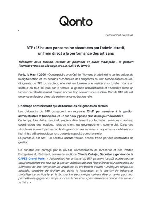 Qonto publie avec OpinionWay une étude inédite sur les enjeux de la digitalisation et les besoins numériques des dirigeants du BTP. Menée auprès de 300 dirigeants de TPE du secteur, elle met en lumière une réalité structurelle : dans un secteur où tout se joue sur le terrain, la gestion administrative et financière reste un facteur de ralentissement majeur, encore trop souvent sous-estimé. Dans le BTP, elle est devenue un facteur direct de performance opérationnelle.