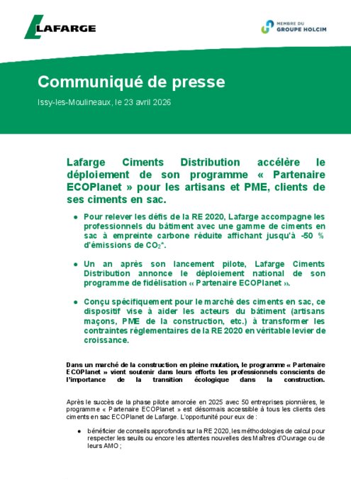 Industriels 23 avril 2026 - 14:35 Pour relever les défis de la RE 2020, Lafarge accompagne les professionnels du bâtiment avec une gamme de ciments en sac à empreinte carbone réduite affichant jusqu’à -50 % d’émissions de CO2. PDF (172 Ko) Télécharger