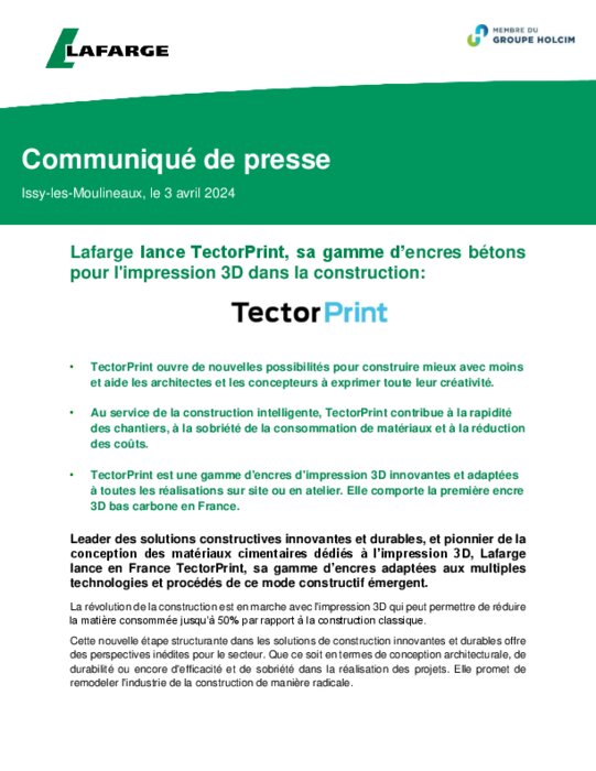 Leader des solutions constructives innovantes et durables, et pionnier de la conception des matériaux cimentaires dédiés à l’impression 3D, Lafarge lance en France TectorPrint, sa gamme d’encres adaptées aux multiples technologies et procédés de ce mode constructif émergent.