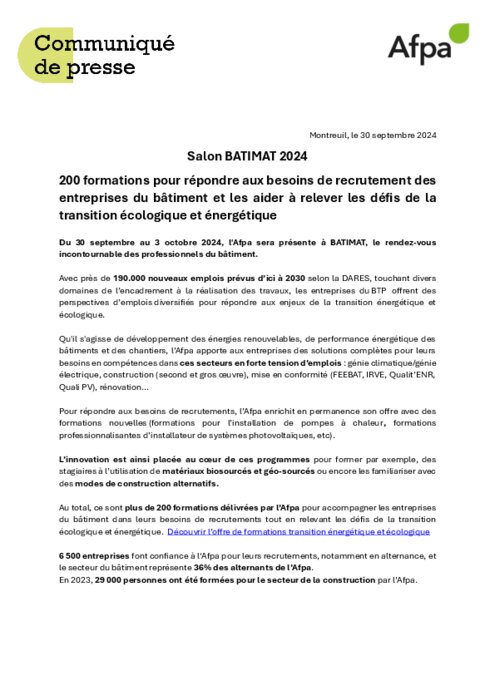 Du 30 septembre au 3 octobre 2024, l'Afpa sera présente à Batimat, le rendez-vous incontournable des professionnels du bâtiment. Avec près de 190 000 nouveaux emplois prévus d’ici à 2030 selon la Dares, touchant divers domaines de l’encadrement à la réalisation des travaux, les entreprises du BTP offrent des perspectives d’emplois diversifiés pour répondre aux enjeux de la transition énergétique et écologique.