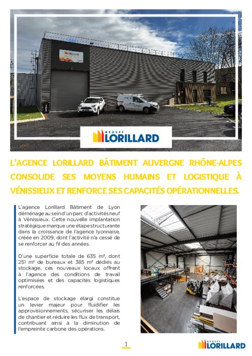 L’agence Lorillard Bâtiment de Lyon déménage au sein d’un parc d’activités neuf à Vénissieux. Cette nouvelle implantation stratégique marque une étape structurante dans la croissance de l’agence lyonnaise, créée en 2009, dont l’activité n’a cessé de se renforcer au fil des années. D’une superficie totale de 635 m², dont 251 m² de bureaux et 385 m² dédiés au stockage, ces nouveaux locaux offrent à l’agence des conditions de travail optimisées et des capacités logistiques renforcées.