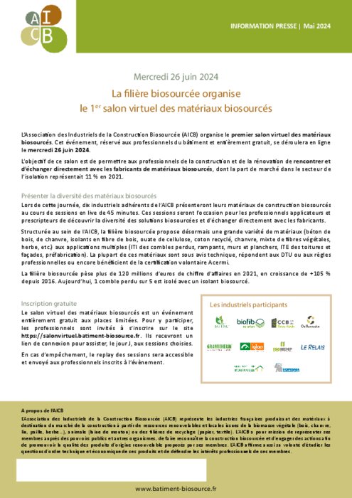 L’Association des Industriels de la Construction Biosourcée (AICB) organise le premier salon virtuel des matériaux