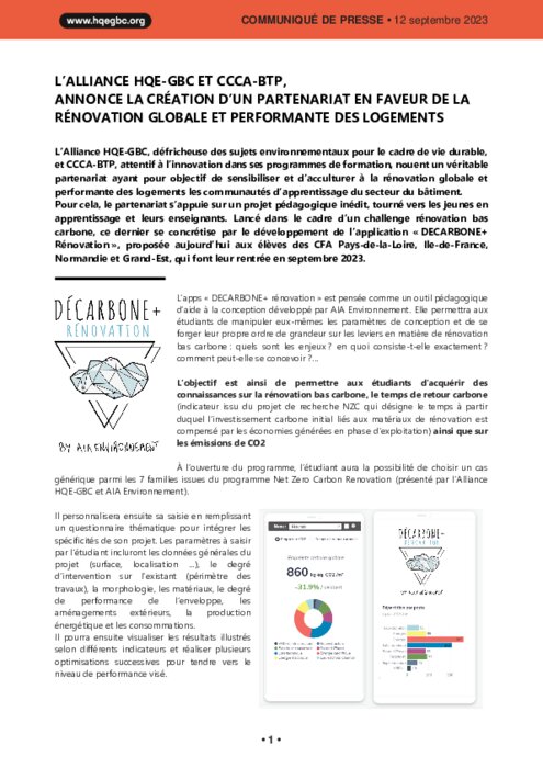 L’Alliance HQE-GBC, défricheuse des sujets environnementaux pour le cadre de vie durable, et CCCA-BTP, attentif à l’innovation dans ses programmes de formation, nouent un véritable partenariat ayant pour objectif de sensibiliser et d’acculturer à la rénovation globale et performante des logements les communautés d’apprentissage du secteur du bâtiment.