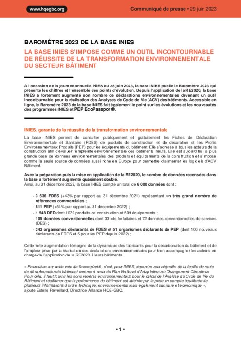 A l’occasion de la journée annuelle INIES du 28 juin 2023, la base INIES publie le Baromètre 2023 qui présente les chiffres et l’ensemble des points d’évolution. Depuis l’application de la RE2020, la base INIES a fortement augmenté son nombre de déclarations environnementales devenant un outil incontournable pour la réalisation des Analyses de Cycle de Vie (ACV) des bâtiments.