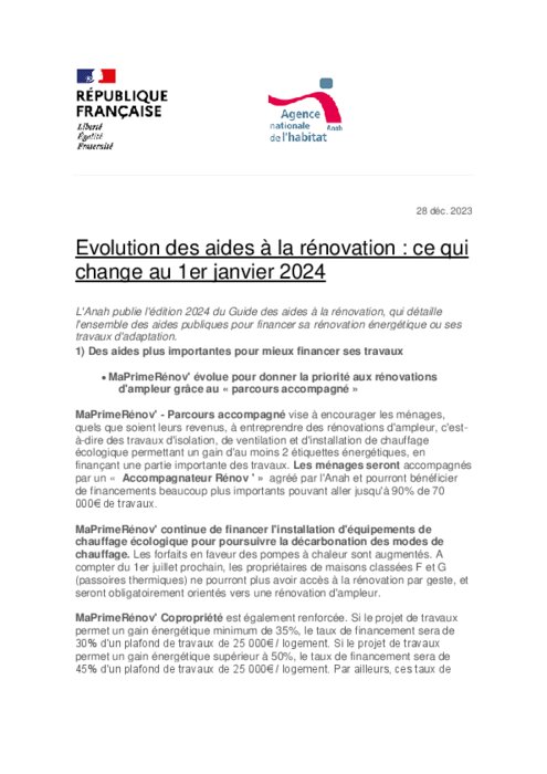 Institutionnels 03 janvier 2024 - 10:11 L'Anah publie l'édition 2024 du Guide des aides à la rénovation, qui détaille l'ensemble des aides publiques pour financer sa rénovation énergétique ou ses travaux d'adaptation. PDF (114 Ko) Télécharger