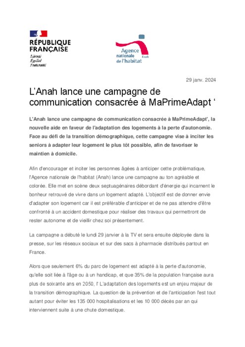 L'Anah lance une campagne de communication consacrée à MaPrimeAdapt', la nouvelle aide en faveur de l'adaptation des logements à la perte d'autonomie. Face au défi de la transition démographique, cette campagne vise à inciter les seniors à adapter leur logement le plus tôt possible, afin de favoriser le maintien à domicile.