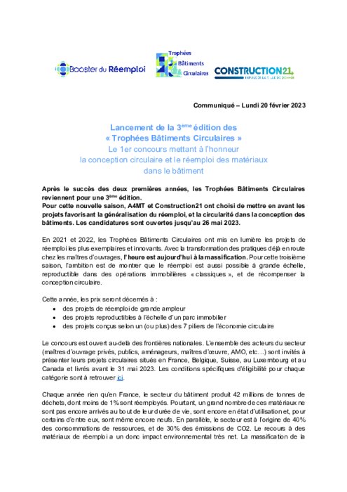 Après le succès des deux premières années, les Trophées Bâtiments Circulaires reviennent pour une 3ème édition. Pour cette nouvelle saison, A4MT et Construction21 ont choisi de mettre en avant les projets favorisant la généralisation du réemploi, et la circularité dans la conception des bâtiments. Les candidatures sont ouvertes jusqu’au 26 mai 2023.