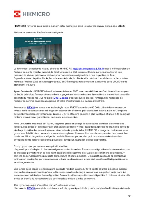 Industriels 16 avril 2026 - 16:44 HIKMICRO a lancé sa nouvelle série LRG10 de capteurs de niveau radar, conçue pour offrir une mesure de haute précision grâce à la technologie FMCW 80 GHz, même dans des environnements industriels complexes. PDF (111 Ko) Télécharger