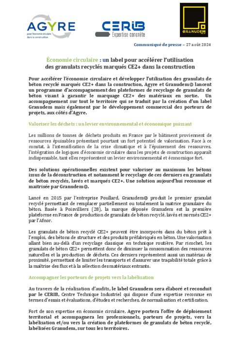 Pour accélérer l’économie circulaire et développer l’utilisation des granulats de béton recyclé marqués CE2+ dans la construction, Agyre et Granudem lancent un programme d’accompagnement des plateformes de recyclage de granulats de béton visant à garantir le marquage CE2+ des matériaux en sortie. Un accompagnement sur tout le territoire qui se traduit par la création d’un label Granudem mais également par le développement commercial des porteurs de