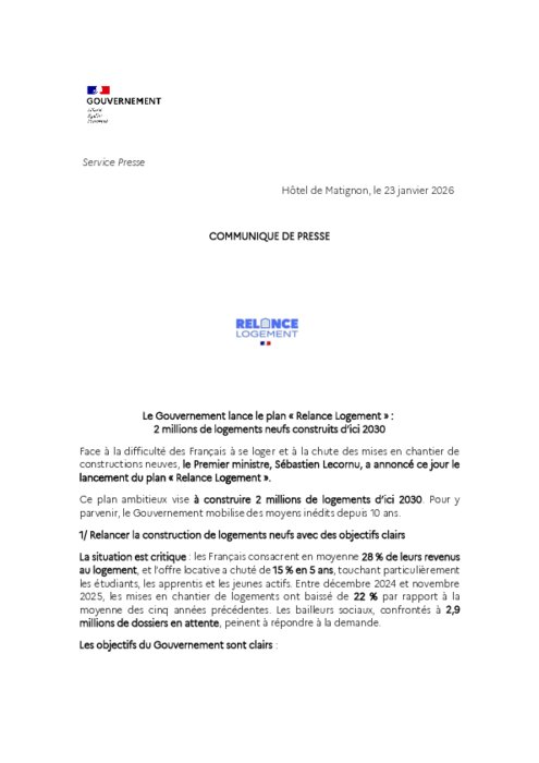 Face à la difficulté des Français à se loger et à la chute des mises en chantier de constructions neuves, le Premier ministre, Sébastien Lecornu, a annoncé ce jour le lancement du plan « Relance Logement ». Ce plan ambitieux vise à construire 2 millions de logements d'ici 2030. Pour y parvenir, le gouvernement mobilise des moyens inédits depuis 10 ans.