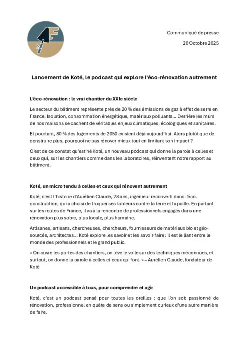 Services 20 octobre 2025 - 16:46 Ingénieur reconverti dans l’éco-construction, Aurélien Claude part sur les routes de France à la rencontre d’artisans, chercheurs et architectes engagés pour une rénovation plus sobre, plus locale et plus humaine. PDF (1 Mo) Télécharger