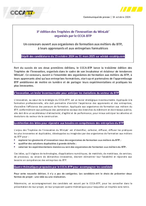 Fort du succès de ses deux premières éditions, le CCCA-BTP lance la troisième édition des Trophées de l’innovation, organisés dans le cadre de son incubateur et éclaireur de tendances WinLab’. Ce concours, ouvert à l’ensemble des organismes de formation aux métiers du BTP, à leurs apprenants ainsi qu’aux entreprises formatrices, start-up et partenaires de l’apprentissage BTP ambitionne de mettre en lumière et de partager leurs expérimentations et pratiques les plus innovantes.