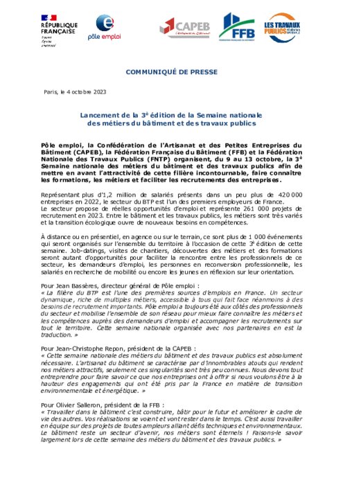 Pôle emploi, la Confédération de l'Artisanat et des Petites Entreprises du Bâtiment (Capeb), la Fédération Française du Bâtiment (FFB) et la Fédération Nationale des Travaux Publics (FNTP) organisent, du 9 au 13 octobre, la 3e Semaine nationale des métiers du bâtiment et des travaux publics afin de mettre en avant l’attractivité de cette filière incontournable, faire connaître les formations, les métiers et faciliter les recrutements des entreprises.