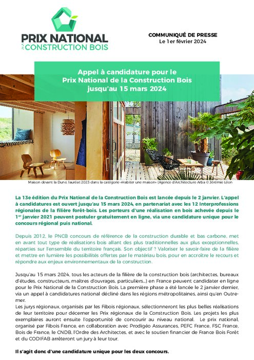 Lancement de l'appel à candidatures 2024 du Prix National de la Construction Bois