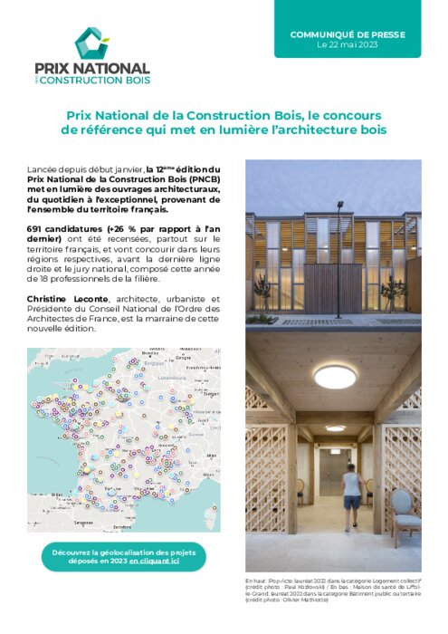 Institutionnels 22 mai 2023 - 13:53 Le Prix National de la Construction Bois (PNCB), concours de référence qui met en lumière l'architecture vertueuse, entre dans sa phase finale, avec la clôture des candidatures régionales et l'annonce du jury de cette 12ème édition. PDF (2 Mo) Télécharger