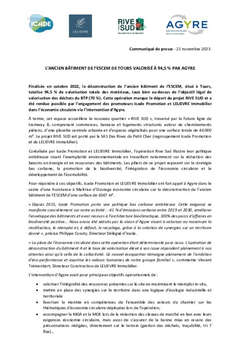 Finalisée en octobre 2022, la déconstruction de l’ancien bâtiment de l’ESCEM, situé à Tours, totalise 94,5 % de valorisation totale des matériaux, taux bien au-dessus de l’objectif légal de valorisation des déchets du BTP (70 %). Cette opération marque le départ du projet RIVE SUD et a été rendue possible par l’engagement des promoteurs Icade Promotion et LELIEVRE Immobilier dans l’économie circulaire via l’intervention d’Agyre.