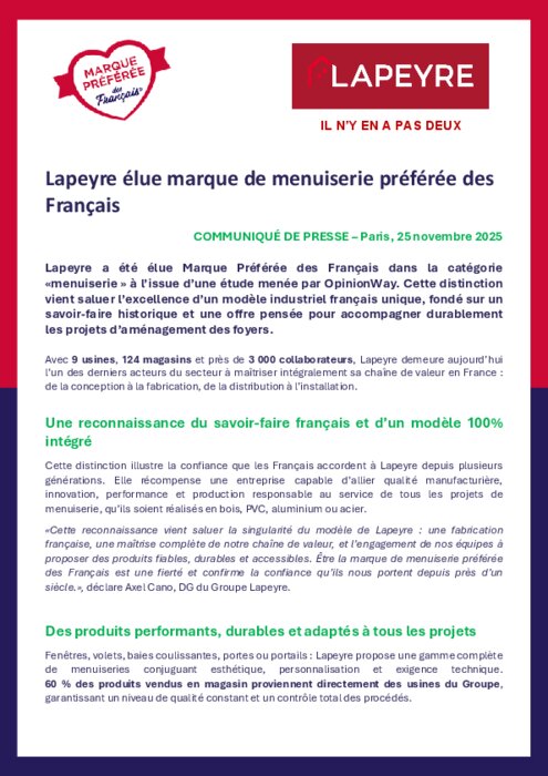 Lapeyre a été élue Marque Préférée des Français dans la catégorie «menuiserie » à l’issue d’une étude menée par OpinionWay. Cette distinction vient saluer l’excellence d’un modèle industriel français unique, fondé sur un savoir-faire historique et une offre pensée pour accompagner durablement les projets d’aménagement des foyers.