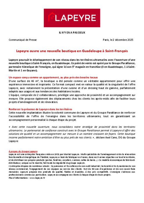 Lapeyre poursuit le développement de son réseau dans les territoires ultramarins avec l’ouverture d’une nouvelle boutique à Saint-François, en Guadeloupe. Ce point de vente est opéré par le Groupe Paralliance, partenaire historique de l’enseigne, qui signe ici son 5ᵉ magasin en franchise (3 en Guadeloupe, 1 à SaintMartin et 1 en Guyane).