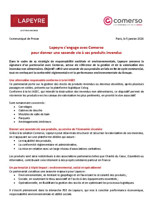Dans le cadre de sa stratégie de responsabilité sociétale et environnementale, Lapeyre annonce la signature d’un partenariat avec Comerso, acteur de référence de la gestion et de la valorisation des invendus non alimentaires. Objectif : offrir une seconde vie aux produits arrivés en fin de cycle commercial, tout en renforçant la conformité réglementaire et la performance environnementale du Groupe.