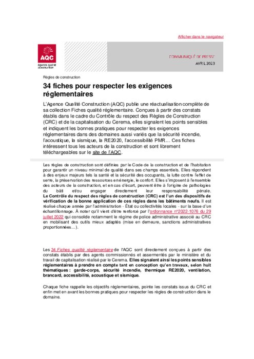 L'Agence Qualité Construction (AQC) publie une réactualisation complète de sa collection Fiches qualité réglementaire. Conçues à partir des constats établis dans le cadre du Contrôle du respect des Règles de Construction (CRC) et de la capitalisation du Cerema, elles signalent les points sensibles et indiquent les bonnes pratiques pour respecter les exigences réglementaires.