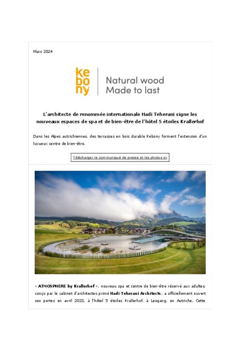Industriels 11 mars 2024 - 10:26 Dans les Alpes autrichiennes, des terrasses en bois durable Kebony forment l’extension d’un luxueux centre de bien-être. PDF (815 Ko) Télécharger