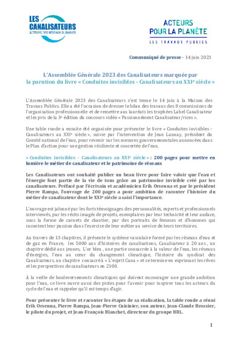 Les Canalisateurs ont souhaité publier un beau livre pour faire valoir que l’eau et l’énergie font partie de la vie de tous grâce au patrimoine invisible créé par les canalisateurs. Préfacé par l’écrivain et académicien Erik Orsenna et par le président Pierre Rampa, l’ouvrage de 200 pages a pour ambition de raconter l’histoire du métier de canalisateur dont le XXI e siècle a saisi l’importance.