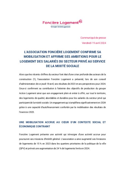 Alors que les récents chiffres du secteur font état d’une crise profonde des acteurs de la construction, l’association Foncière Logement a présenté, lors de son conseil d’administration de ce jeudi 18 avril, ses résultats de 2023 et ses perspectives pour 2024. Ceux-ci confirment sa contribution à l’atteinte des objectifs de production du groupe Action Logement ainsi que son engagement plein et entier à offrir, sur tout le territoire, des logements de qualité, abordables et durables pour les salariés du secteur privé qui participent de la mixité sociale. Un engagement qui s'amplifiera significativement en 2024 grâce à une capacité d’autofinancement confortée par la mobilisation des résultats de l’exercice 2023.