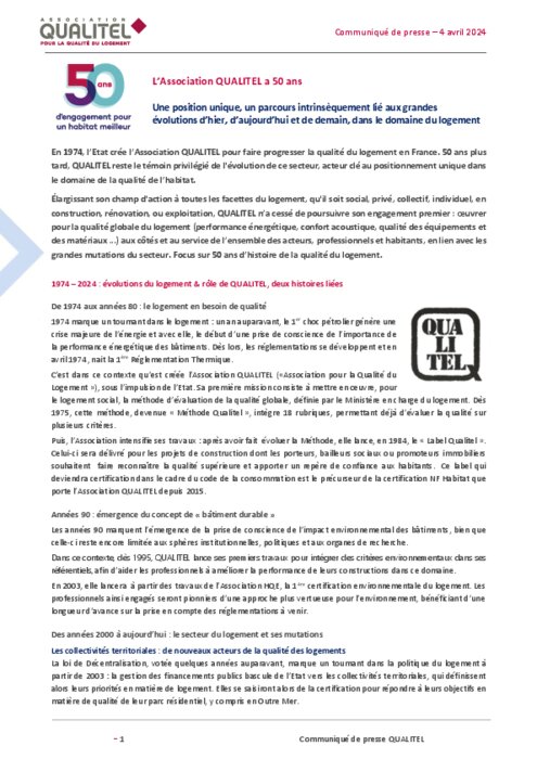 En 1974, l’Etat crée l’Association Qualitel pour faire progresser la qualité du logement en France. 50 ans plus tard, Qualitel reste le témoin privilégié de l'évolution de ce secteur, acteur clé au positionnement unique dans le domaine de la qualité de l’habitat.