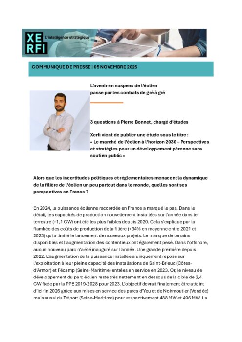 En 2024, la puissance éolienne raccordée en France a marqué le pas. Dans le détail, les capacités de production nouvellement installées sur l’année dans le terrestre (+1,1 GW) ont été les plus faibles depuis 2020. Cela s’explique par la flambée des coûts de production de la filière (+34% en moyenne entre 2021 et 2023) qui a limité le lancement de nouveaux projets. Le manque de terrains disponibles et l’augmentation des contentieux ont également pesé.