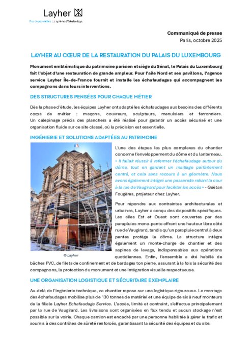 Monument emblématique du patrimoine parisien et siège du Sénat, le Palais du Luxembourg fait l’objet d’une restauration de grande ampleur. Pour l’aile Nord et ses pavillons, l’agence service Layher Île-de-France fournit et installe les échafaudages qui accompagnent les compagnons dans leurs interventions.