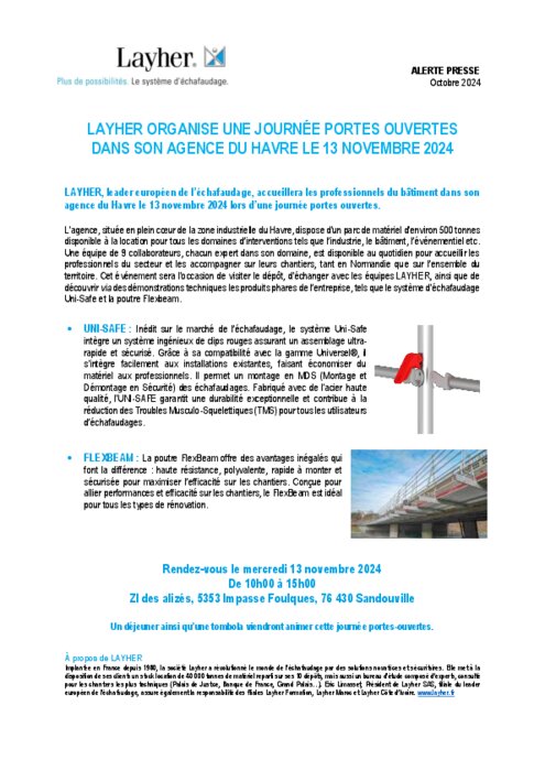 LAYHER, leader européen de l’échafaudage, accueillera les professionnels du bâtiment dans son agence du Havre le 13 novembre 2024 lors d’une journée portes ouvertes. L'agence, située en plein cœur de la zone industrielle du Havre, dispose d'un parc de matériel d'environ 500 tonnes disponible à la location pour tous les domaines d’interventions tels que l’industrie, le bâtiment, l’événementiel etc.