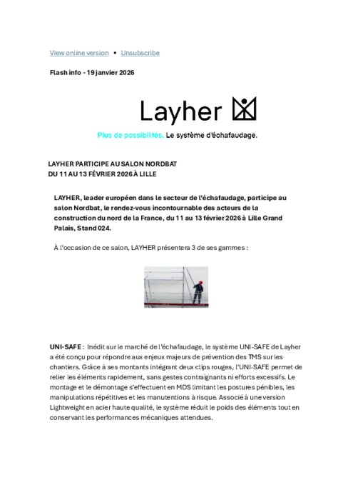 Inédit sur le marché de l’échafaudage, le système UNI-SAFE de Layher a été conçu pour répondre aux enjeux majeurs de prévention des TMS sur les chantiers. Grâce à ses montants intégrant deux clips rouges, l’UNI-SAFE permet de relier les éléments rapidement, sans gestes contraignants ni efforts excessifs. Le montage et le démontage s’effectuent en MDS limitant les postures pénibles, les manipulations répétitives et les manutentions à risque. Associé à une version Lightweight en acier haute qualité, le système réduit le poids des éléments tout en conservant les performances mécaniques attendues.