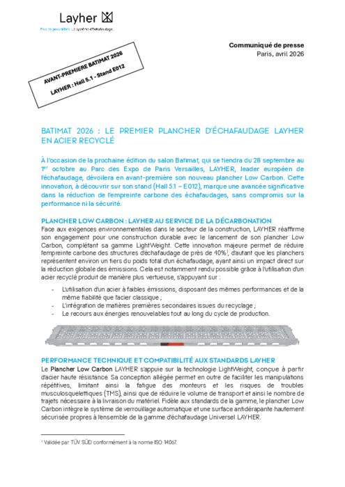 À l'occasion de la prochaine édition du salon Batimat, qui se tiendra du 28 septembre au 1er octobre au Parc des Expo de Paris Versailles, LAYHER, leader européen de l’échafaudage, dévoilera en avant-première son nouveau plancher Low Carbon. Cette innovation, à découvrir sur son stand (Hall 5.1 – E012), marque une avancée significative dans la réduction de l’empreinte carbone des échafaudages, sans compromis sur la performance ni la sécurité.