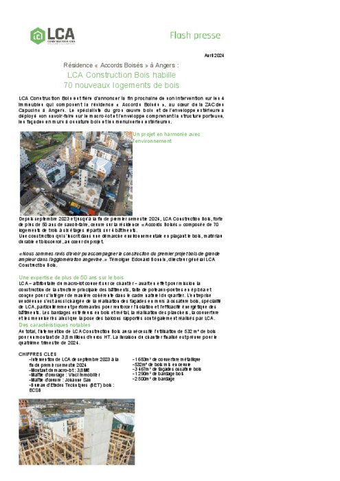 LCA Construction Bois est fière d'annoncer la fin prochaine de son intervention sur les 4 immeubles qui composent la résidence « Accords Boisés », au cœur de la ZAC des Capucins à Angers. Le spécialiste du gros œuvre bois et de l’enveloppe extérieure a déployé son savoir-faire sur le macro-lot et l’enveloppe comprenant la structure porteuse, les façades en murs à ossature bois et les menuiseries extérieures.