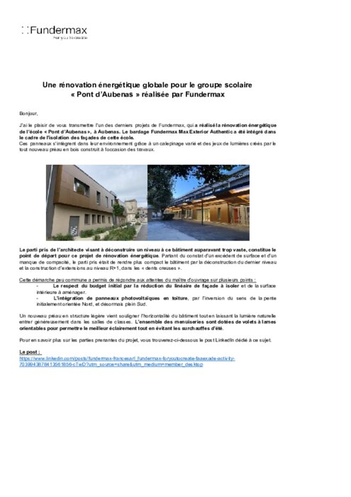 Le bardage Fundermax Max Exterior Authentic a été intégré dans le cadre de l’isolation des façades de cette école.