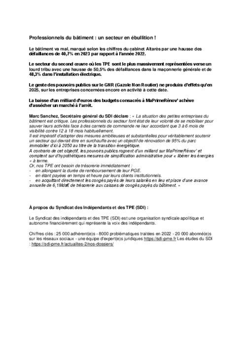 Marc Sanchez, Secrétaire général du SDI déclare : « La situation des petites entreprises du bâtiment est critique. Les professionnels du secteur font état de leur volonté de se mobiliser pour sauver leurs activités face à des carnets de commande ne leur accordant que 3 à 6 mois de visibilité contre 12 à 18 mois habituellement.