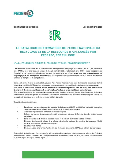 Les premières formations du catalogue en2r ont été créées sur mesure à la demande de FEDEREC, suite à un appel à référencement, en juin 2023, auprès d’organismes de formation, avec des cahiers des charges répondant aux exigences et aux attentes des entreprises du recyclage.