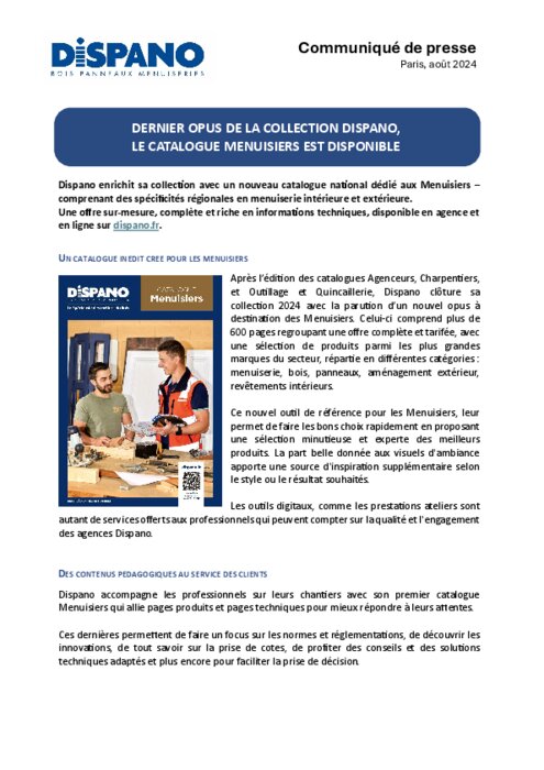 Dispano enrichit sa collection avec un nouveau catalogue national dédié aux Menuisiers – comprenant des spécificités régionales en menuiserie intérieure et extérieure. Une offre sur-mesure, complète et riche en informations techniques, disponible en agence et en ligne sur dispano.fr.