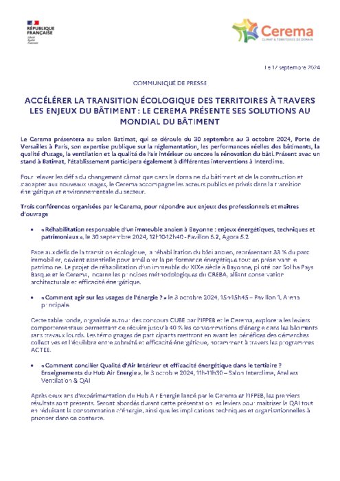 Le Cerema présentera au salon Batimat, qui se déroule du 30 septembre au 3 octobre 2024, Porte de Versailles à Paris, son expertise publique sur la réglementation, les performances réelles des bâtiments, la qualité d’usage, la ventilation et la qualité de l’air intérieur ou encore la rénovation du bâti. Présent avec un stand à Batimat (Hall 1, stand J-042), l’établissement participera également à différentes interventions à Interclima.