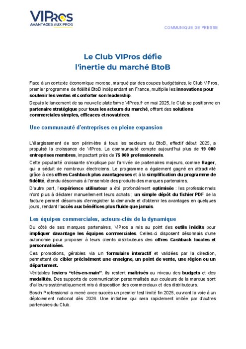 Face à un contexte économique morose, marqué par des coupes budgétaires, le Club VIPros, premier programme de fidélité BtoB indépendant en France, multiplie les innovations pour soutenir les ventes et conforter son leadership.