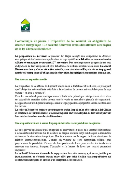 La proposition de loi visant à prévenir les litiges relatifs aux obligations de décence énergétique et à sécuriser leur application en copropriété sera débattue en commission des affaires économiques ce mercredi 27 novembre. Des aménagements pragmatiques aux obligations de travaux peuvent être débattus, et d'ailleurs existent déjà, mais le collectif Rénovons estime qu’en sa rédaction actuelle, ce texte rate sa cible, et crée un trop grand nombre d’exemptions à l’obligation de rénovation énergétique des passoires thermiques.