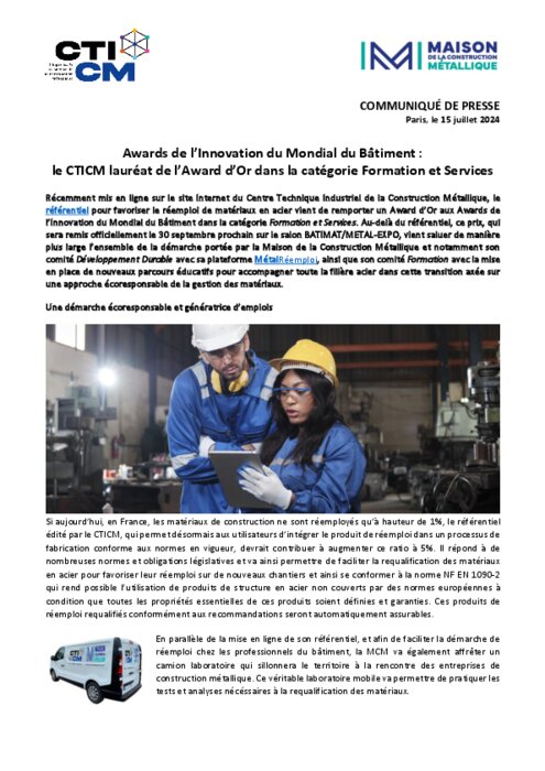 Récemment mis en ligne sur le site Internet du Centre Technique Industriel de la Construction Métallique, le référentiel pour favoriser le réemploi de matériaux en acier vient de remporter un Award d’Or aux Awards de l’Innovation du Mondial du Bâtiment dans la catégorie Formation et Services.