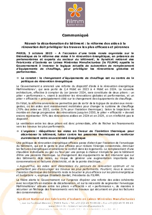 A l’occasion d’une table ronde organisée sur la thématique de la réforme des aides à la rénovation énergétique, en présence de parlementaires et experts du secteur du bâtiment, le Syndicat national des Fabricants d'Isolants en Laines Minérales Manufacturées (le FILMM) appelle le Gouvernement à inverser la logique actuelle de subvention de remplacement d’équipements de chauffage, pour privilégier les rénovations globales et performantes.